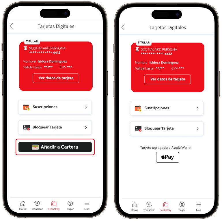 Hazlo en Chile y el extranjero con tus Tarjetas Scotiabank, desde tu Smartphone o Smartwatch, descargando la App para cada billetera.